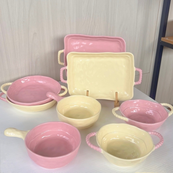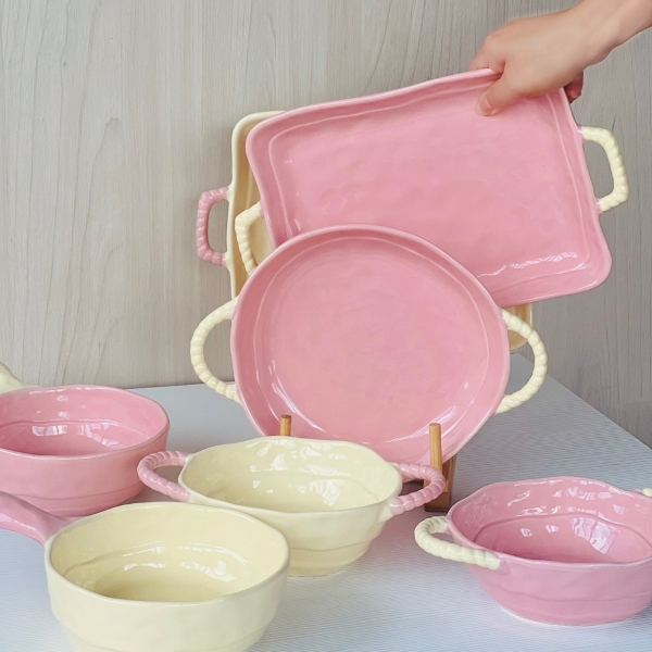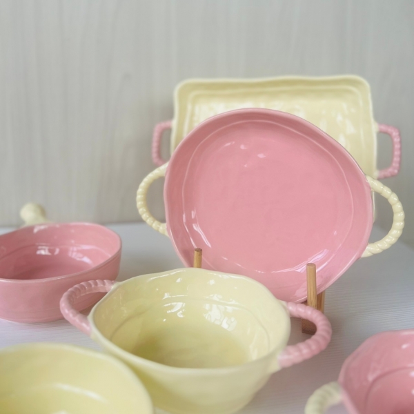 這組碗盤的粉是那種很嫩的粉,還有很溫柔的奶油黃,手把部分是編織的造型讓餐具方便拿取也防燙
