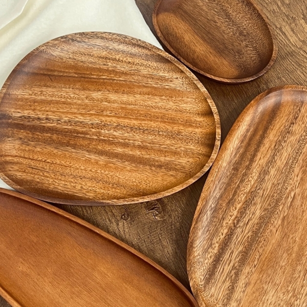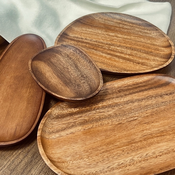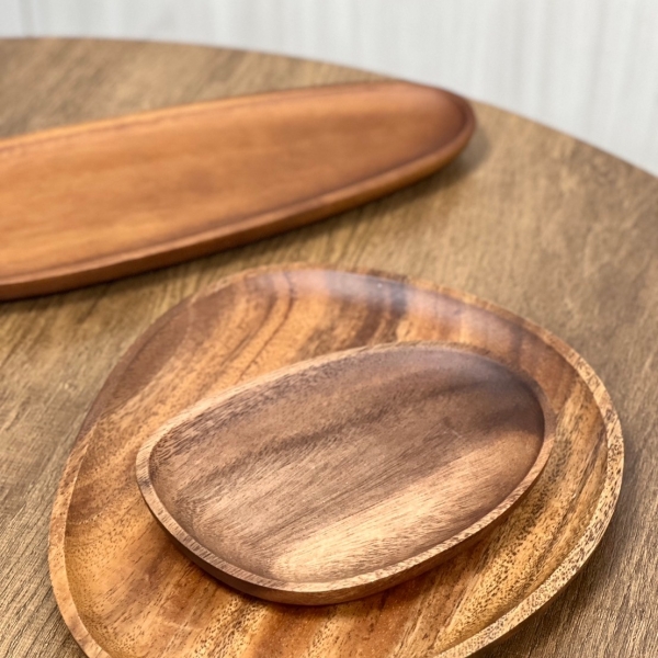不規則的盤子設計打破傳統對稱形式,有種隨性而獨特的視覺效果,且相思木具有高密度和良好的耐用性
